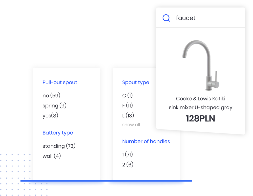 Contextual filters was an essential feature for Castorama, as selling homeware and garden goods requires a lot of context. We enhanced search results with dynamic facets and filters to improve user experience. What is more, we implemented advanced AI automation algorithms, which can analyze the context of each search query and select only relevant filters and facets. This provided Castorama.pl users with more flexibility, and notably boosted the probability of a sale.