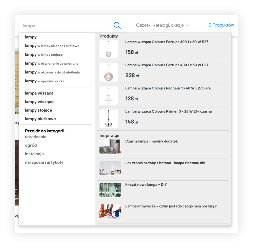 Castorama.pl is actively using content marketing – they have over 7,000 articles related to DIY projects, ideas, and inspirations. The content they create has purely educational purposes; thus, it is an excellent resource in navigating the shopping and buying processes. SearchNode provides intelligent suggestions in autocomplete, helping to reach users who are not ready to buy yet through this non-product content. This way, Castorama manages to attract, engage, and capture customers early in their user journey.