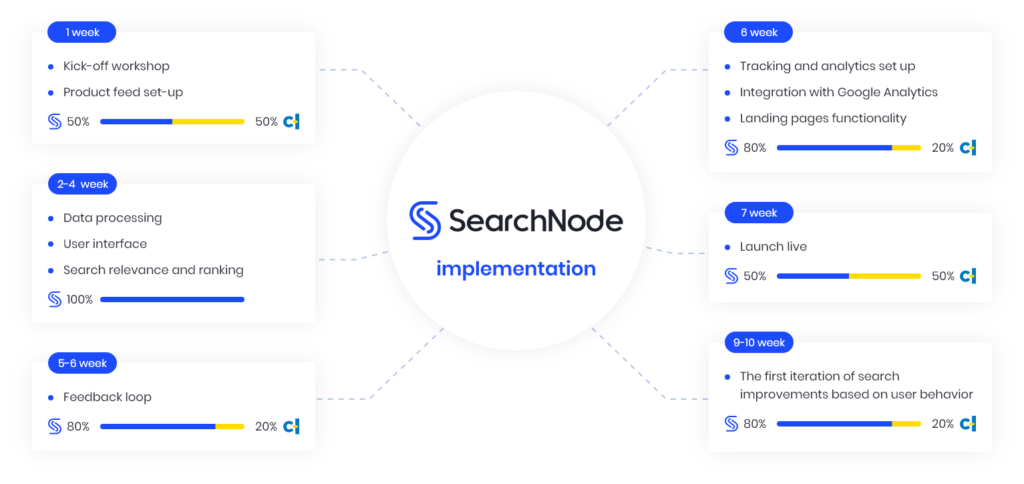 The main task of the Castorama Polska search team was to communicate and discuss with SearchNode goals and features of the site search to make sure that it fits business objectives and priorities, and to provide feedback during the implementation process. From the technical point of view, they only needed to provide data export API according to our requirements. SearchNode did all the rest – from data analysis/optimization and tracking scripts to the creation of search user interface and custom AI algorithms.